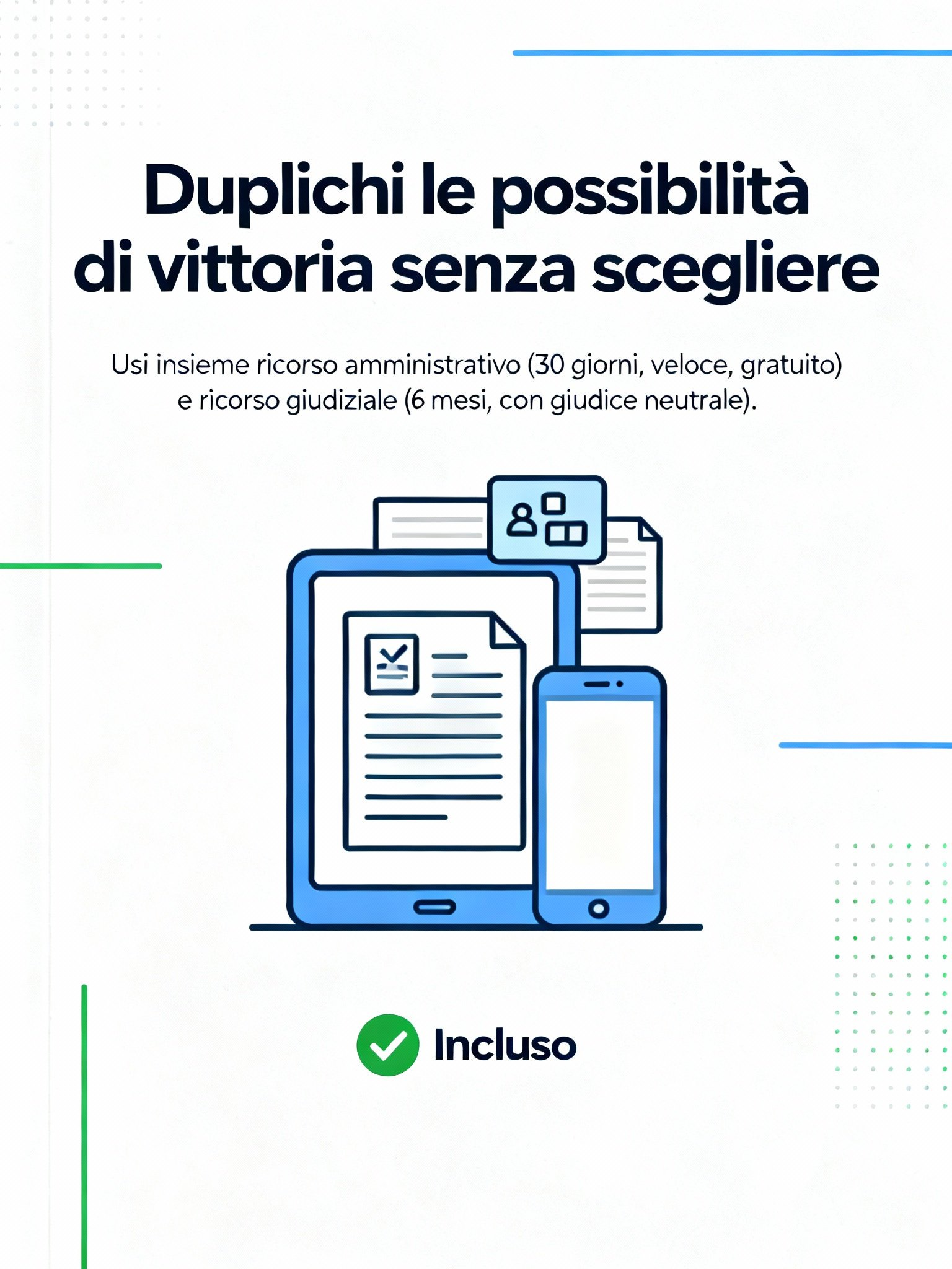 ✓ Quando presentare l'amministrativo ✓ Come preparare il giudiziale mentre aspetti risposta ✓ Quando abbandonare uno per concentrarti sull'altro ✓ Come usare il primo per rafforzare il secondo ✓ Tempistiche precise